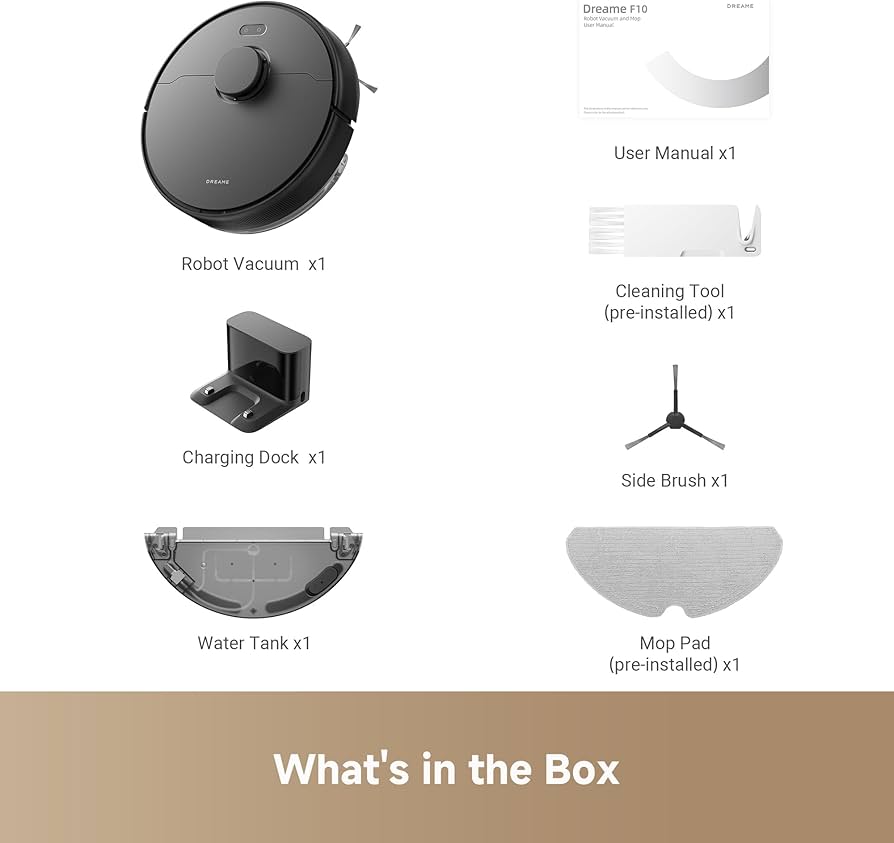 The Dreame F10 ships with everything you need to get started: the robot unit (with a pre-installed mop pad), a side brush, a charging dock, water tank, and documentation. Dreame doesn’t include a cleaning solution, but that’s a minor omission for this price range.